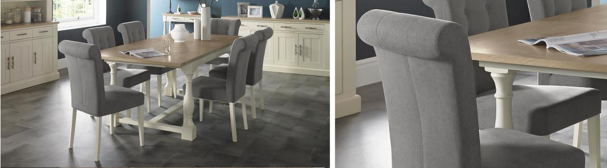 The classically styled Pierre dining collection has two equally elegant looks. Choose rustic aged oak, or the fresh, two tone style of aged oak and beech with an antique white painted finish. Pair the extending table with fully upholstered or cross back dining chairs, in a choice of fabric or leather upholstery. Features include stylish turned legs, bespoke handles and blum soft-close drawers.